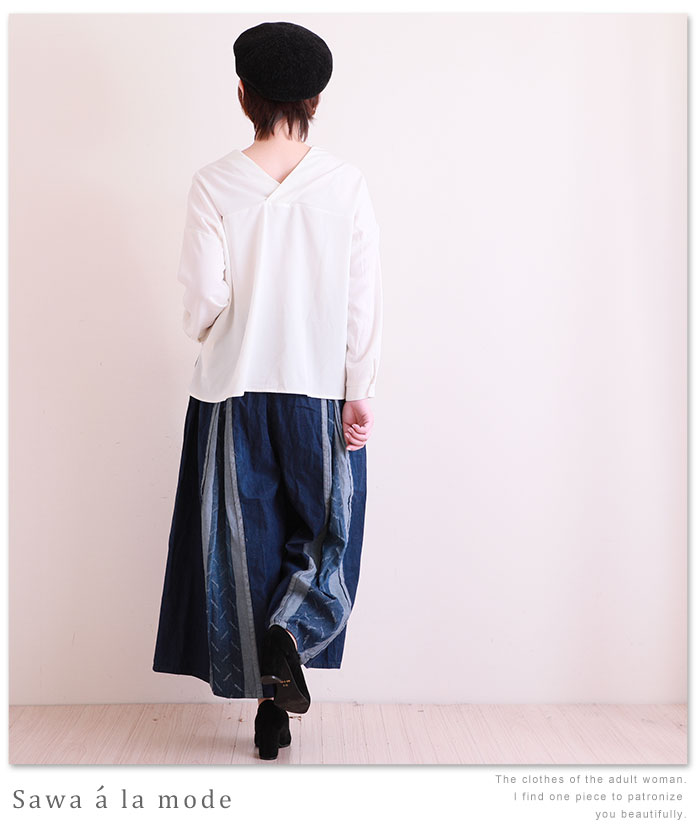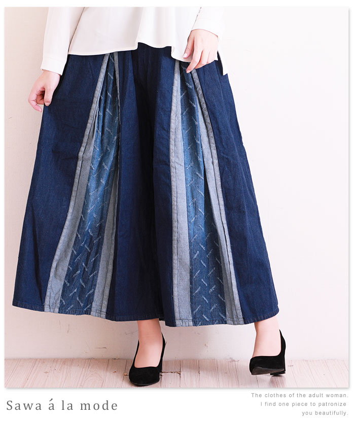 濃淡ラインがお洒落なデニムワイドパンツ。レディース ファッション ワイドパンツ デニム ブルー ライン ロング丈 春 夏 秋 冬 オフィスカジュアル 体系カバー 同窓会 およばれ 大人カジュアル ウエストゴム サワアラモード otona kawaii【1月8日8時販売新作】