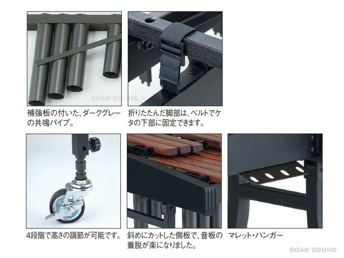 ●音域=F45〜C88(3-1 /2オクターブ) ●音板材:最高級ホンジュラス産ローズウッド スペシャル・セレクト【DX音板】(木地仕上げ) 音板幅:38mm/音板厚:23mm ●共鳴パイプ:アルミニウム管、ダークグレー ●フレーム:脚部折りたたみ式(折りたたみ時固定ベルト付) キャスター高さ調節可/82〜89cm(4段階) ●寸法:138×77×82〜89cm(間口×奥行×高さ) ●付属品:マイクバルター・マレット、音板カバー
