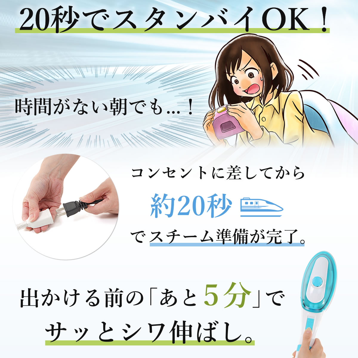 商品情報 電源 100V 50/60Hz、1000Wサイズ 34×12×17cm本体重量 635g素材 ABS +セラミックタンク容量 220ml連続稼働時間 最大20分ドライモード 140-170℃電源コード 1.8mパッケージ内容 スチームアイロン本体、ブラシアタッチメント(毛ブラシ)、はさむアタッチメント、本体スタンド、給水カップ、掃除ブラシ、ミトン、日本語説明書(動画説明入り) 【自動スチームで指がラク】他社製品はスチームを出すために毎回指でボタンを押す必要がありますが、ソクノビは一回スイッチを入れたらあとは持っているだけでOK。